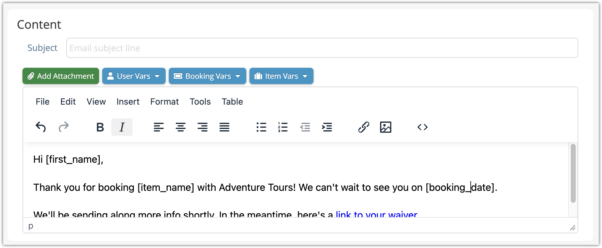You can create email notifications to be sent in a variety of situations–when a new booking is made, scheduled for a number of days before or after a booked-for date, and when a booking’s status is changed.