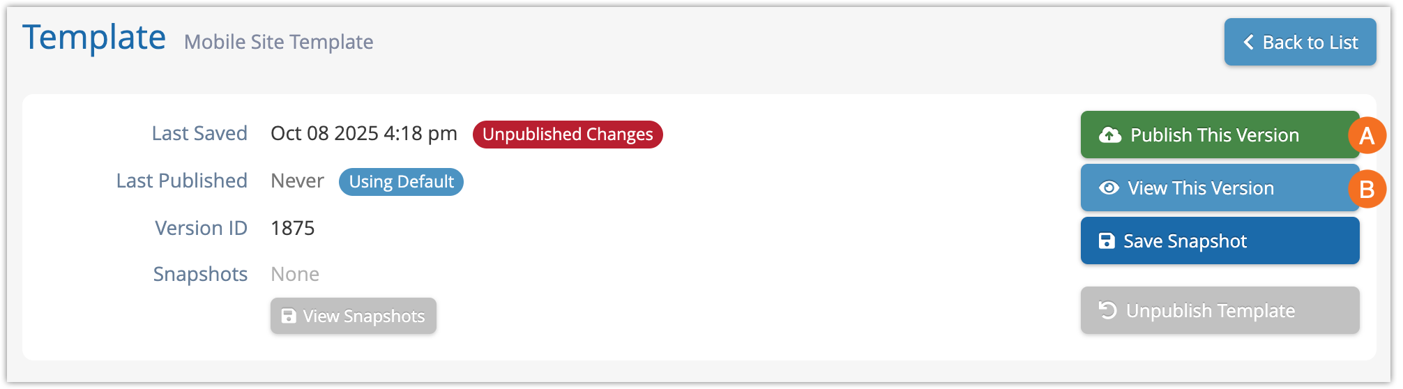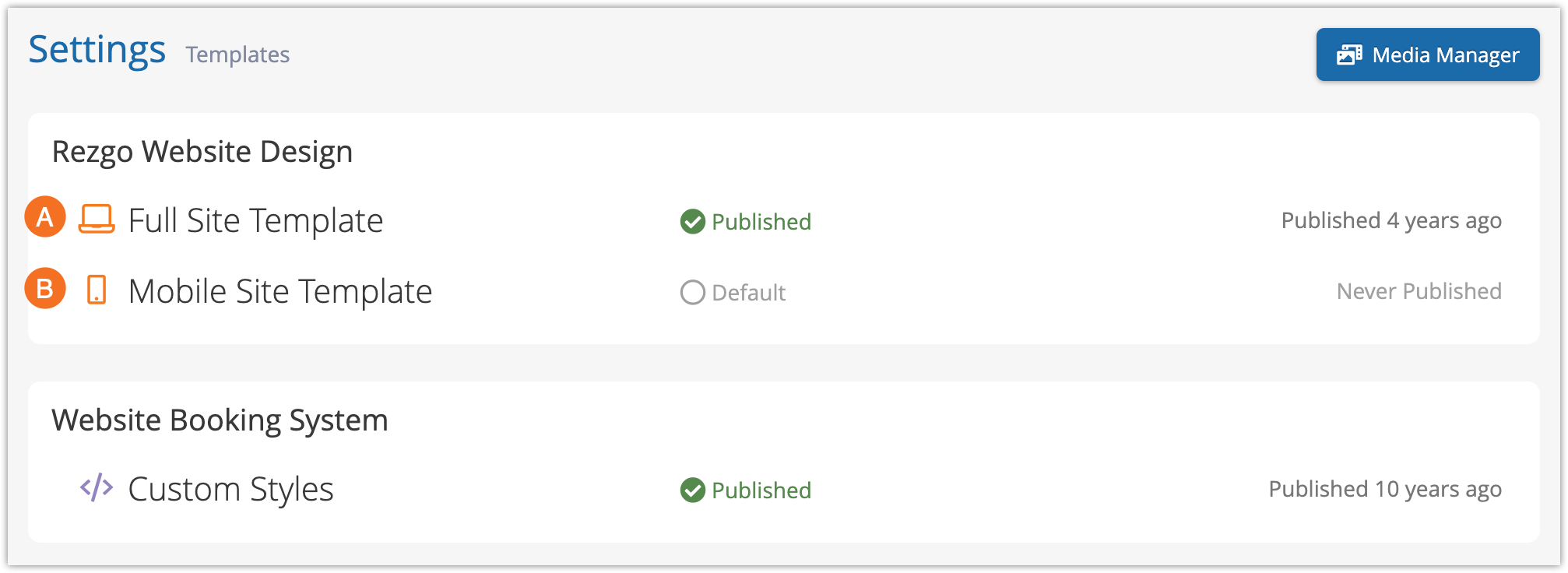 1. Click the template you want to edit: either the Full Site Template (A) or Mobile Template (B).