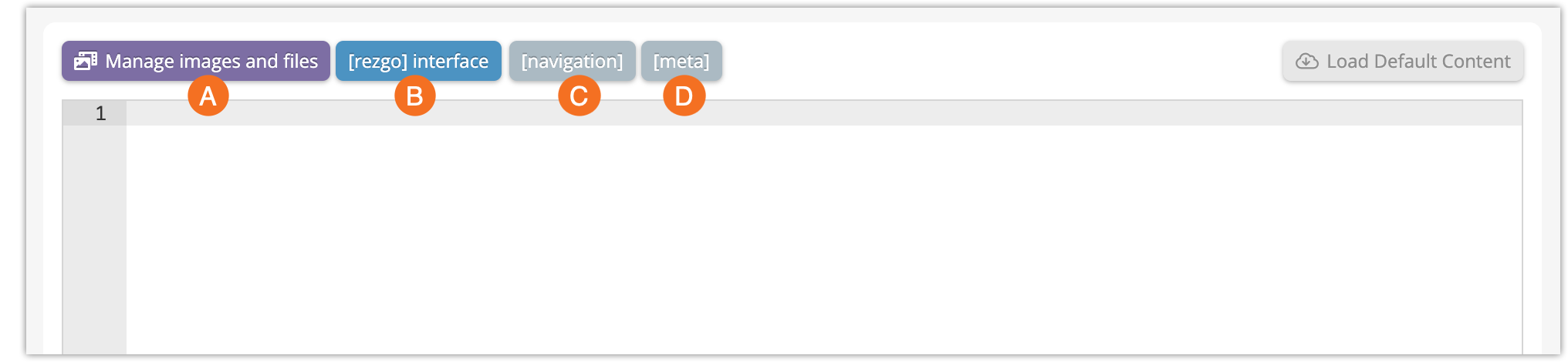 4. While you edit your new template, there are three custom shortcodes to pay attention to: [rezgo] (B), [navigation] (C) and [meta] (D). All three are already positioned in the default template, but if you redesign the template from scratch, you’ll need to insert these codes in the following locations: