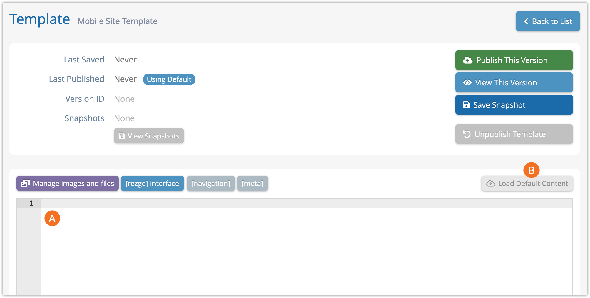 2. Load your custom HTML into the box provided (A). Or, if you just want to make slight tweaks to the default design, you can click Load Default Content (B).