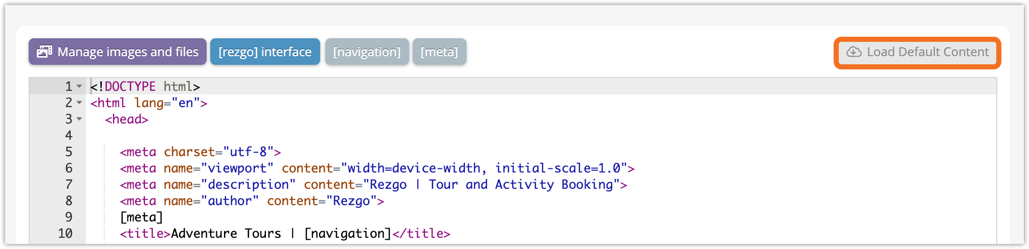 - [rezgo]: Insert this code where you want the Rezgo content placed in your template—your inventory and booking process. Without this, your customers won’t have anything to book.