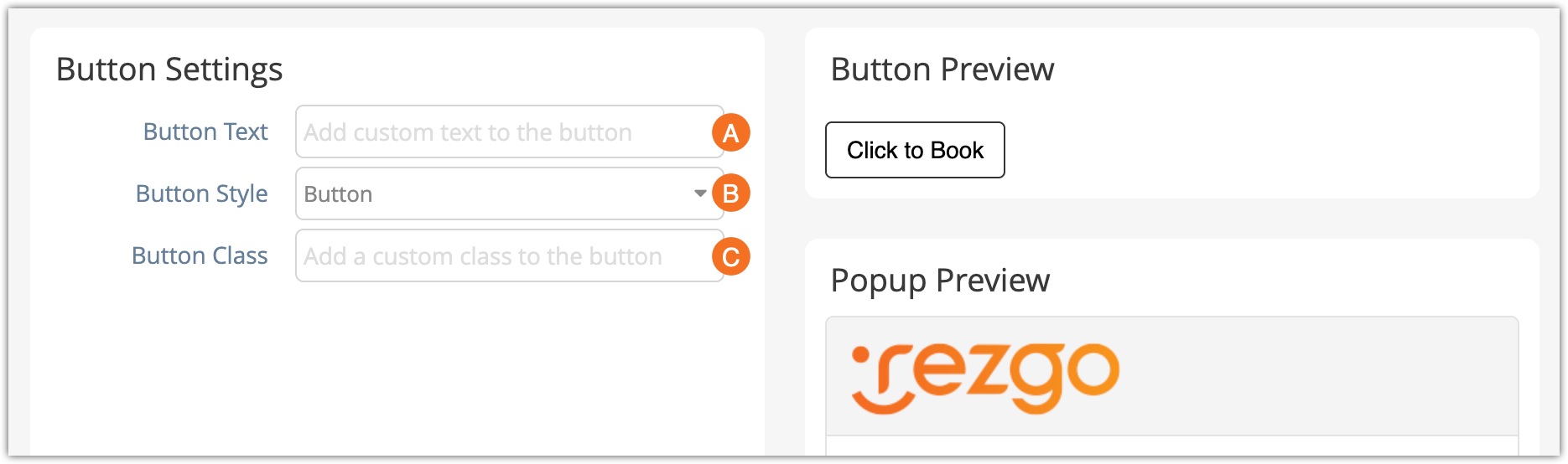 4. Set up your button by giving it a button text label (A). This is the “Call to Action” or CTA, so the text should say something that will motivate your customers, like “Book Now.” You can see a preview of the button under “Button Preview.”