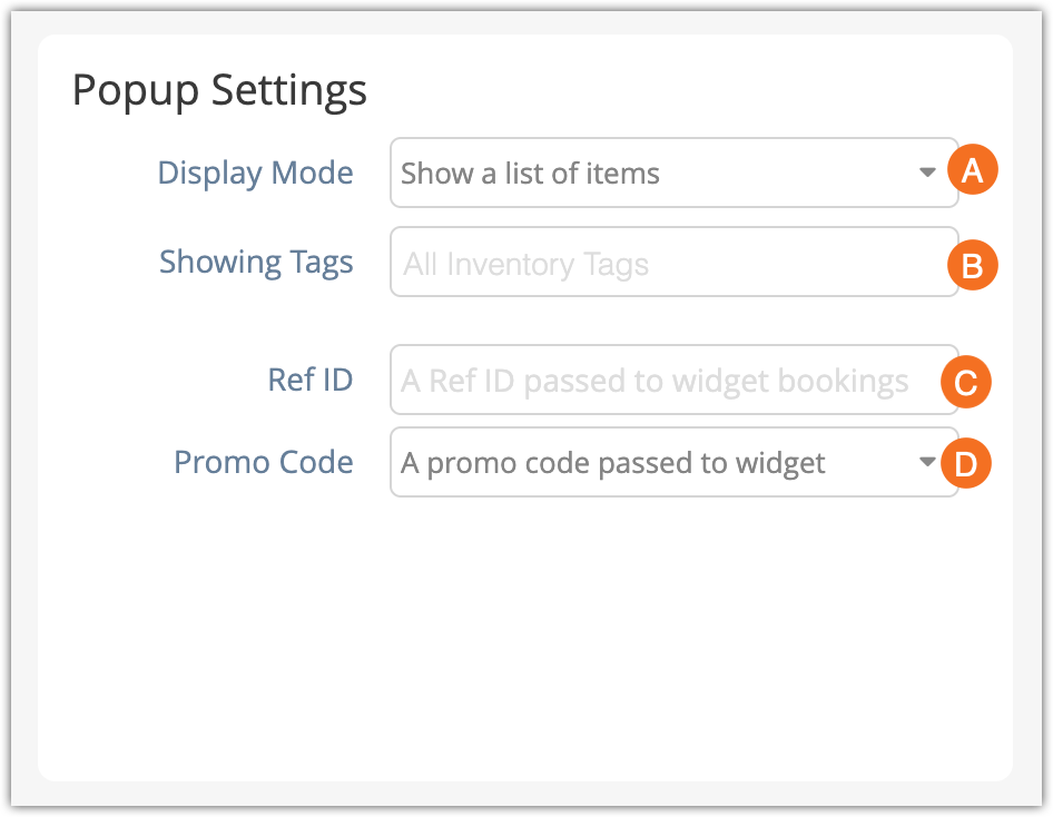 - 10. You can pick a promo code (D), but this is optional. It will automatically be used on bookings made through your widget.