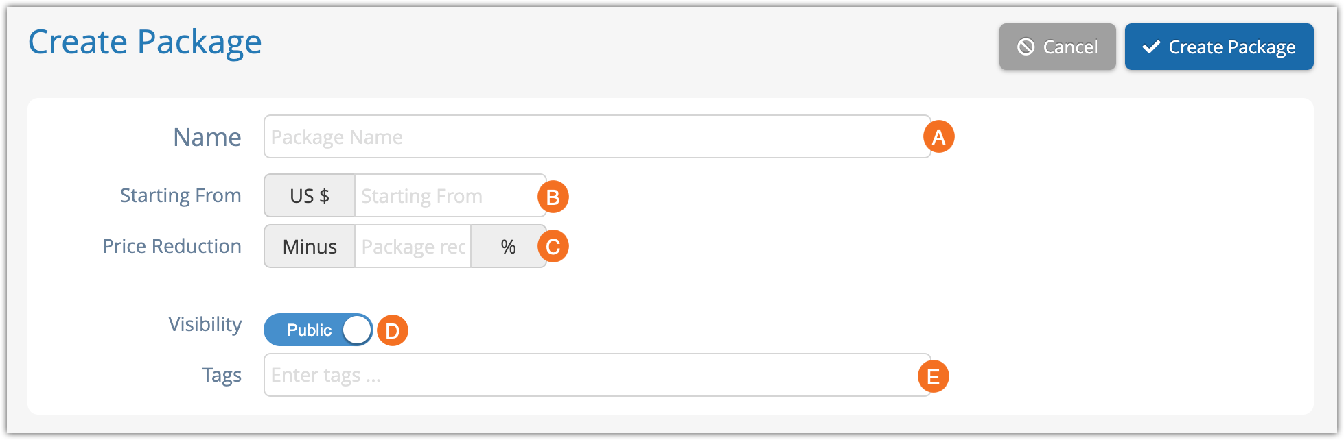 5. Toggle whether the package’s Visibility should be Public (viewable on your booking website) or private (only viewable on the point of sale or with a direct link) (D).