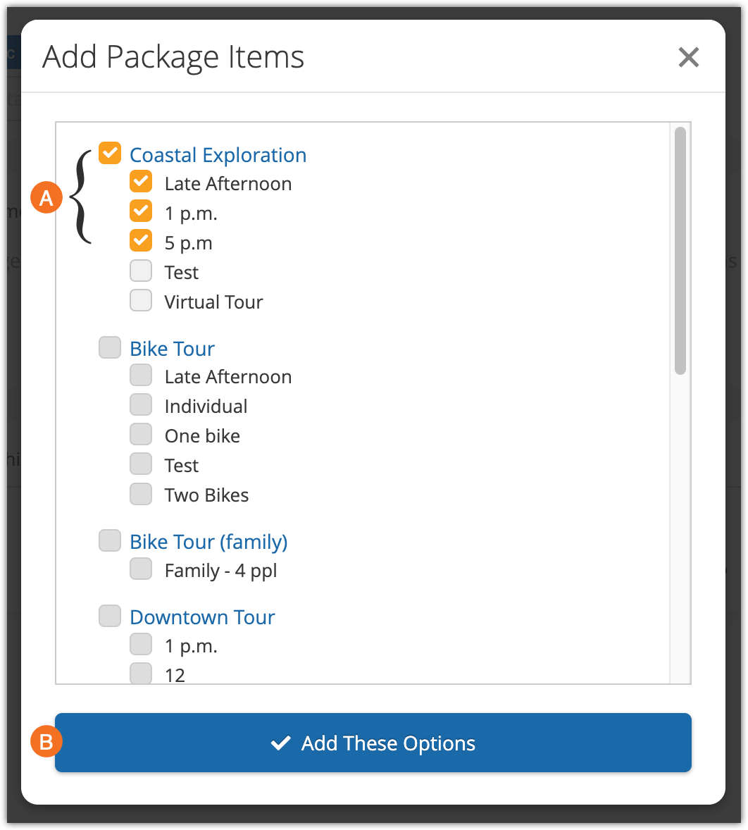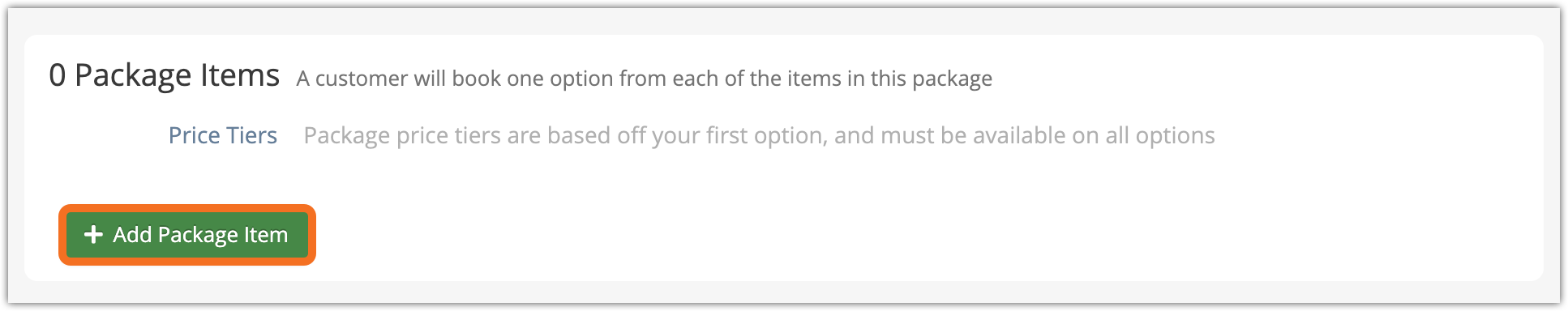 The first inventory option you add to the package determines the package’s available price tiers. For example, if the first option you add to the package has three price tiers–let’s say Adult, Child and Senior–those are the price tiers that will be available when booking the package.