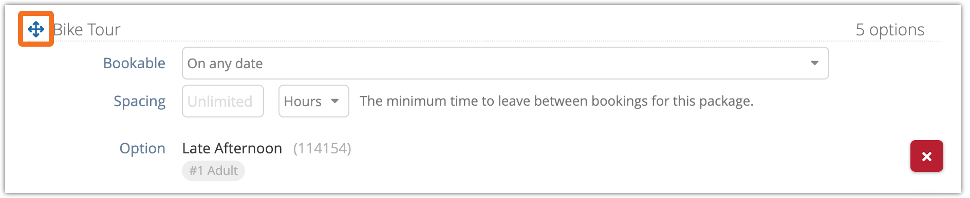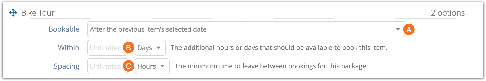 By default, package options can be booked on any date. However, they can also be set to only be bookable within a set number of days or hours around the first or previous option, or after a set number of days or hours from the first or previous option’s date.