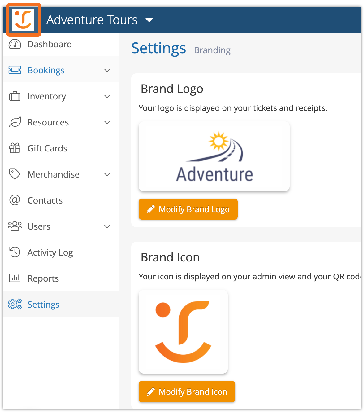 To set your brand icon and logo, go to Settings > Branding in the main menu.