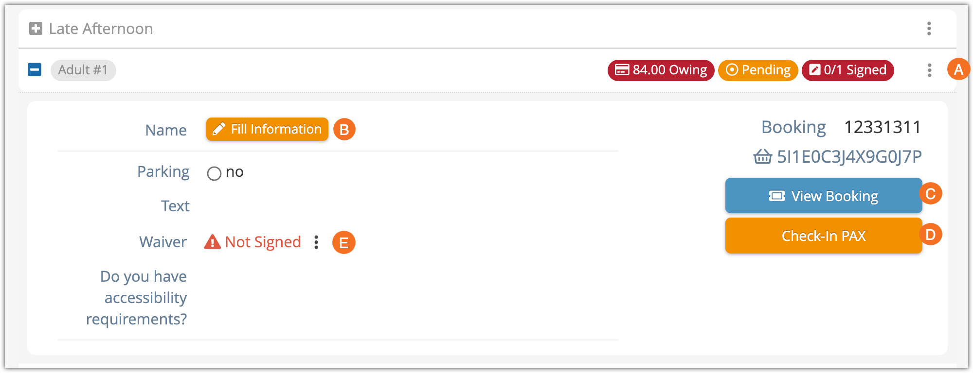 - You can view the booking, refresh PAX, flag no-shows, fill information, check in the whole booking, send waivers, and get a signed waiver by clicking the action button (A).