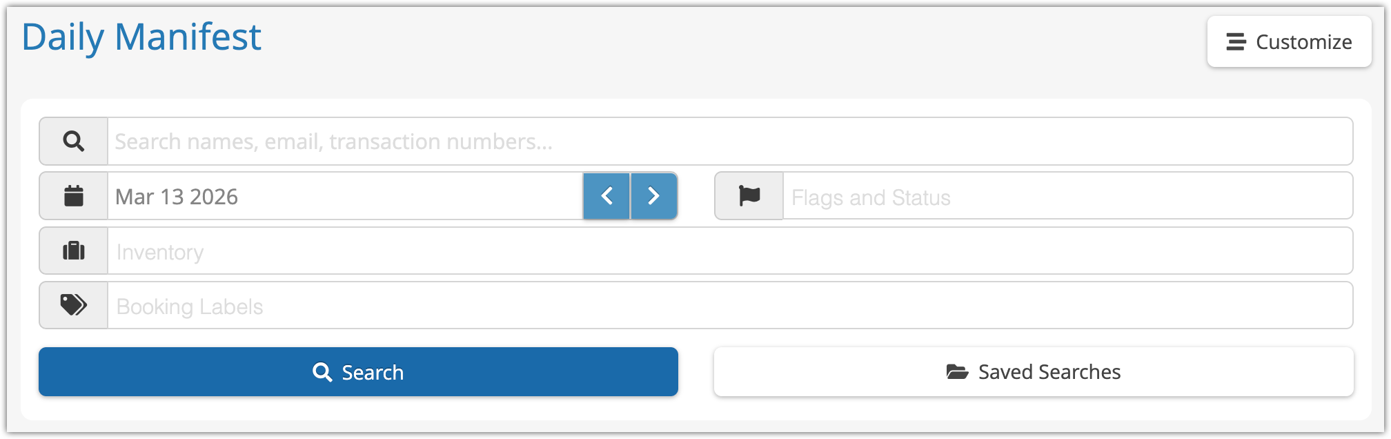 By default, the daily manifest will show you all of today’s PAX. You can narrow down your search by inventory, labels, flags and status, name, transaction numbers and other search options, and change the date being searched if needed.