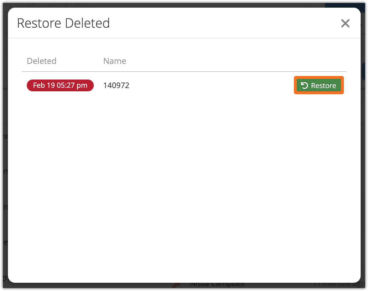 3. Find the user you want to restore. On the left, you’ll see the date and time the user was deleted.